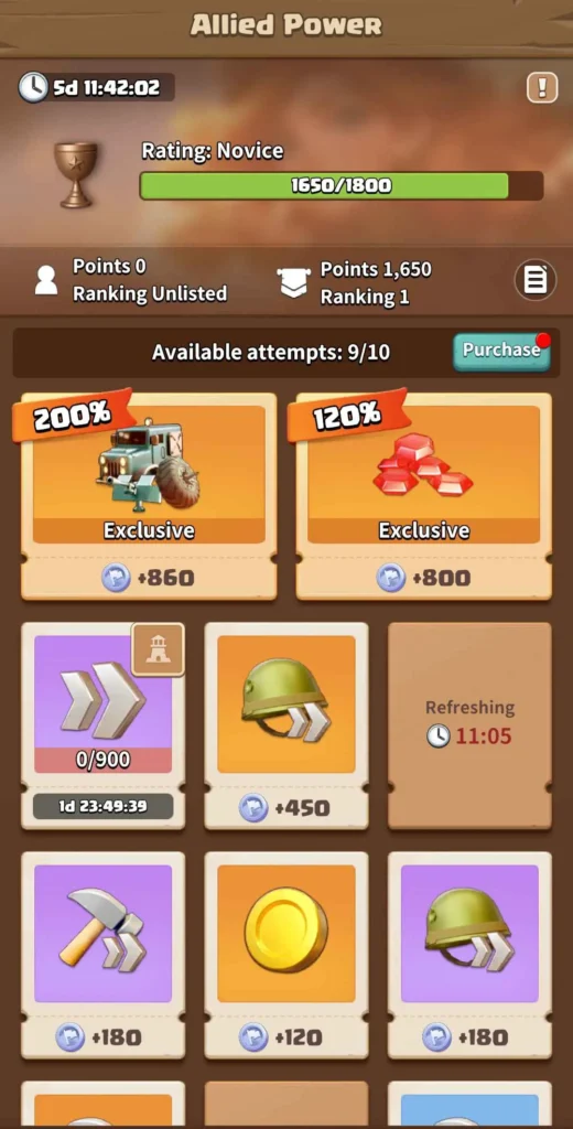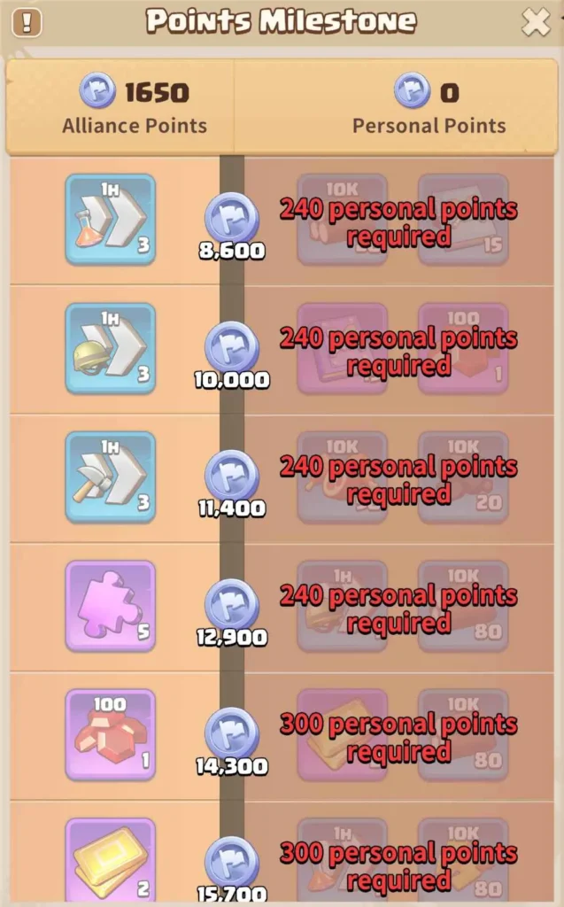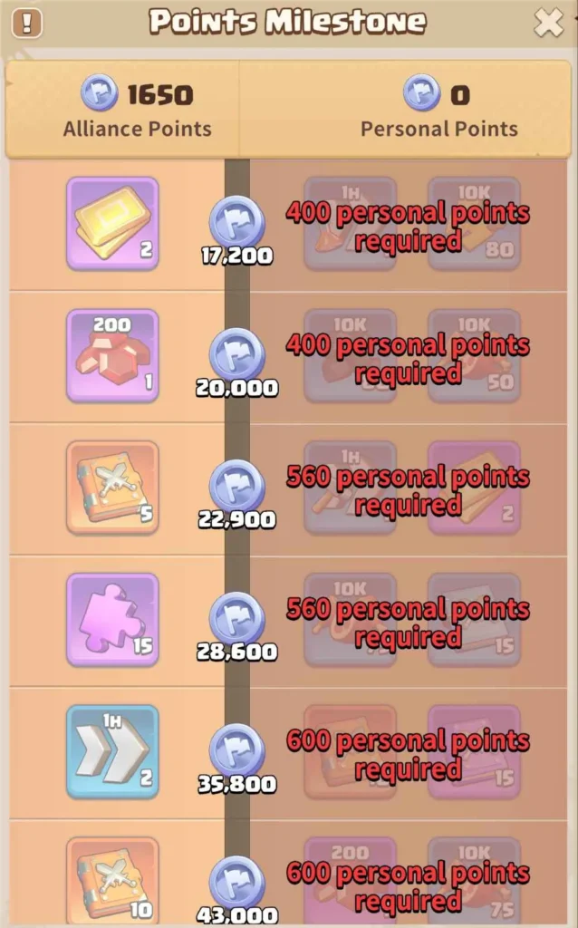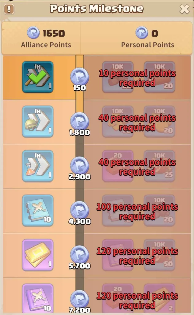 - Point Rewards: Once the alliance’s points reach the target value, all participating members can claim a milestone reward. If individual points also reach the target, members can claim additional personal rewards.
