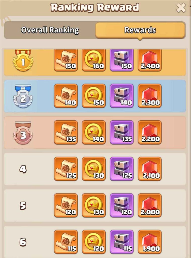 At the end of the event, rewards will be given to players based on their rank. Different ranks will receive different awards.